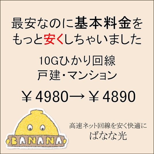 「ばなな光10Gプラン」の新規申込で工事費が無料!さらに月額¥4,980がずっと¥4,890に!「新生活応援キャンペーン」を実施
