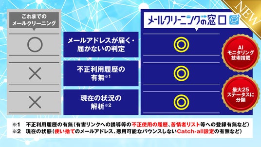 本サービスは「メールクリーニングの窓口(登録第6884184号)」として、2024年9月より試験運用が開始され、すでに国内の大手金融機関・大手通販会社を含む80事業者が約800万件のメールアドレスを解析し、リスクモニタリングを実施してきました。2025年4月より、日本市場において本格展開を開始し、さらなる企業・団体のリスク対策とメールマーケティングの改善を推進します。