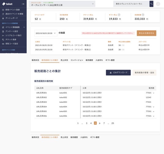 teketは、各経路別に正確な販売データを把握することで、主催者がより効率的に販売状況を管理し、個別のパフォーマンスを可視化できる環境を提供します。
