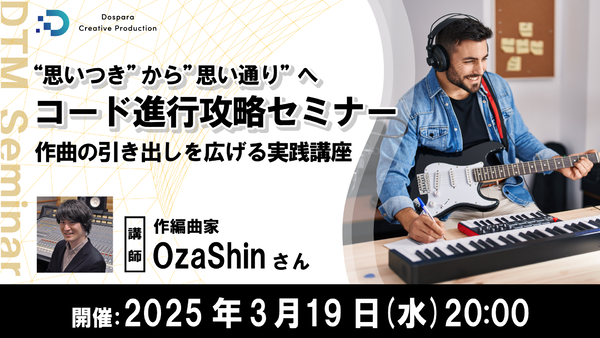 ら”思い通り”へ コード進行攻略セミナー 作曲の引き出しを広げる実践講座」を開催する。このセミナーは3月19日にZoomを通じて開催され、参加費は無料だ。参加希望者は、ドスパラの会員登録が必要で、オンラインで申し込みが可能である。