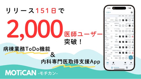 株式会社MedicalAppは、医師の業務、自己研鑽,専門医取得を支援するアプリ「MOTiCAN-モチカン-」の提供開始からわずか151日で、社内カウントにおいて医師ユーザー数が2,000人を突破したことをここに発表いたします。