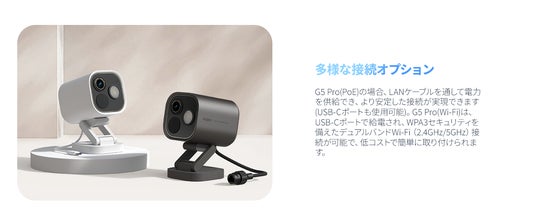 G5 Proは、PoEバージョンとWi-Fiバージョンの2種類があり、ご自宅の環境に合わせて最適な接続方法を選択できます。PoEバージョンの場合、LANケーブル1本を電力供給とネット接続を実現できるため、より安定した接続が実現できます。Wi-Fiバージョンの場合、WPA3セキュリティを備えたデュアルバンドWi-Fi(2.4GHz/5GHz)接続が可能で、低コストで簡単に取り付けられます。どちらのバージョンも、電源供給のための5V2A USB-Cポートを搭載しています。