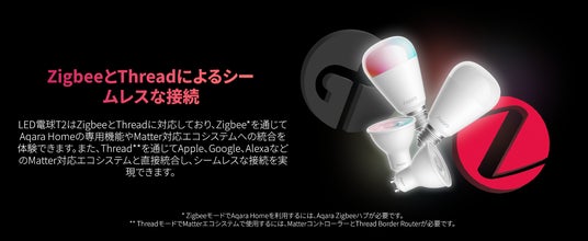 LED電球T2は様々なニーズ合わせられるよう、ZigbeeとThreadという2つの通信方式を同時にサポートしています。Zigbeeモードの場合、Aqara Homeの専用機能を利用できるだけではなく、Aqara Zigbeeハブを経由してMatter対応エコシステムへ統合することもできます。一方、Threadモードの場合、Apple Home、Google Home、AlexaなどのMatter対応エコシステムと直接統合し、強力で低遅延な接続を実現できます。Aqaraの高度な機能を好む場合も、Threadの広範な接続性を求める場合でも、LED電球T2はそのニーズに答えられます。