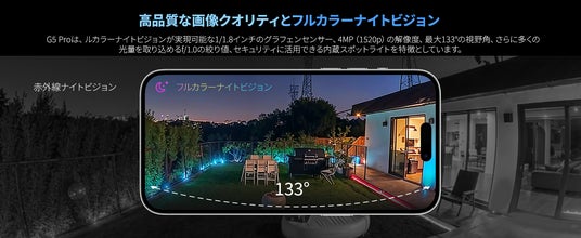 G5 Proは、4MP(1520p)の解像度、最大133°の視野角、f/1.0の絞り値を備え、f/2.0レンズと比較して最大4倍の光を取り込むことができます。これにより、最も暗い夜でもカラーナイトビジョンで自宅の様子を確認できます。大きな1/1.8インチセンサーとグラフェン冷却技術のおかげで、夜間でも長距離から侵入者を識別できます。