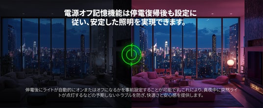 停電後にライトが自動的にオンまたはオフになるかを事前設定することが可能です。これにより、真夜中に突然ライトが点灯するなどの予期しないトラブルを防ぎ、快適さと安心感を提供します。