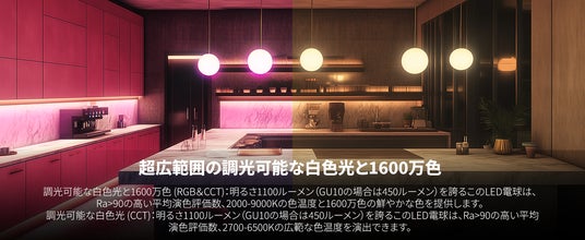 明るさ1100ルーメン(GU10の場合は450ルーメン)を誇るこのLED電球は、2000K~9000Kの超広範な色温度範囲の白色と1600万色の鮮やかなRGB色を提供できます。Ra>90の高い平均演色評価数により、どんなムードやシーンでも最適な光で空間を作り出す事ができます。