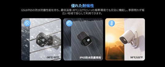G5 ProはIP65規格に対応しており、高い防塵・防水性を有しているだけではなく、最高50°C(122°F)の高温から最低-30°C(-22°F)の極寒まで耐えることができ、季節問わず幅広い地域で安心して利用できます。