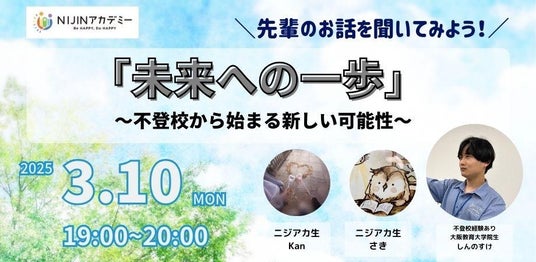 「未来の自分に近い存在を知る」不登校を経験し、現在大学院で学んでいるゲストや、この春NIJINアカデミーを卒業する在校生が、それぞれの経験や思いを語ります。未来に対する不安や悩みを抱える方が、「自分も少し頑張ってみようかな」と思えるきっかけをお届けすることが、このプログラムの目指すところです。