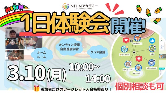 株式会社NIJIN(本社:東京都江東区、代表取締役:星野達郎)が運営する不登校オルタナティブスクール『NIJINアカデミー』は、3/10(月)にメタバース体験ができる選べる1日体験会を実施することをお知らせいたします。