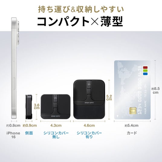 ●ポケットやポーチにラクラク入る。クレジットカードより小さなコンパクトサイズで、iPhone16と同じくらいの薄さです。