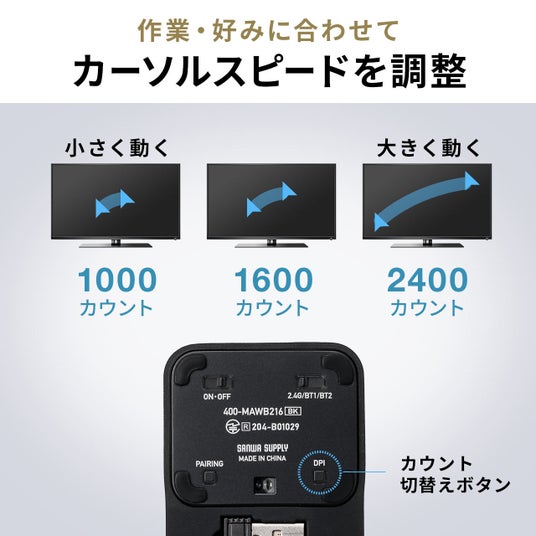 ●裏面のカウント切り替えボタンでカーソルスピード(DPI)を3段階(1000/1600/2400)調整することができます。