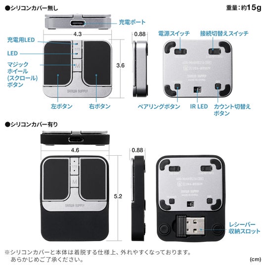 ●付属のシリコンカバーでサイズを調整することができます。シリコンカバーにはUSB Aレシーバーを収納できます。