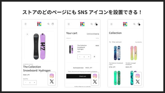 商品ページ(左)、カートページ(中)、コレクションページ(右)での SNS アイコンの表示例