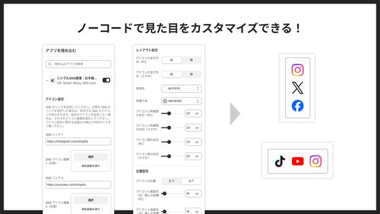 「シンプルSNS誘導|お手軽追従SNSアイコン」では、アイコンの見た目をノーコードでカスタマイズすることができます。コード編集の知識なしで、お好きなデザイン・レイアウトに調整可能です。