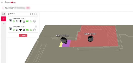 ROBO-HIの管理画面で群管理中の「KIRA B 50」。1機が部屋を出るまで、もう1機が待機する様子