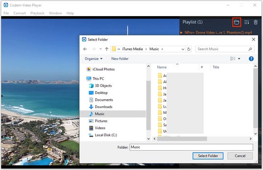 2. 再生したい4K動画を追加します。ドラッグ&ドロップで動画を追加します。もしくは、再生リストの右上のフォルダアイコンをクリックし、動画フォルダを選択して中の動画を一気に追加します。