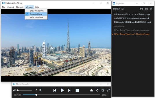 分割モードでは、動画の再生画面、再生リスト、コントロールバーが別々のウィンドウで表示されます。