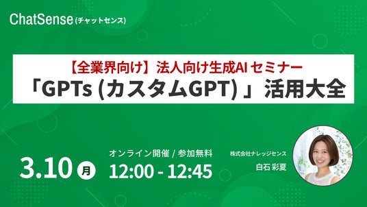 株式会社ナレッジセンス(本社:東京都港区、代表取締役:門脇敦司、以下ナレッジセンス)は、全業界向けセミナー「GPTs (カスタムGPT) 活用大全」を2025年3月10日(月)に開催いたします。
