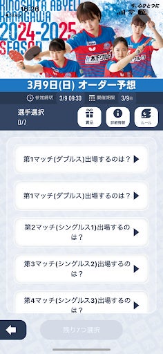 今シーズンのホーム最終戦となる、3月8日(土)・9日(日)に駒沢オリンピック公園総合競技場屋内球技場で行われる「駒沢シリーズ」にて実施される本企画では、試合当日のオーダー予想や第1・2マッチの勝敗予想に加え、会場限定での開催となる第3・4マッチの勝敗予想など、木下アビエル神奈川と木下マイスター東京のそれぞれの試合を予想する内容となっており、試合はもちろんのこと、予想結果までも楽しめます。