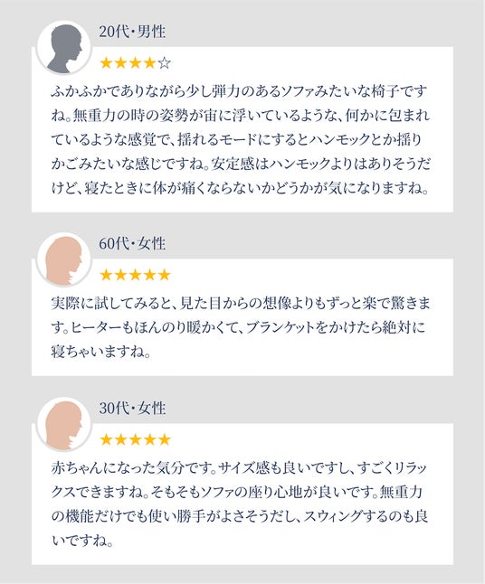 本製品のコンセプトは、「無重力の心地よさ」と「ゆらゆらスウィングモード」を再現することで重力の束縛から解き放たれたようなリラックス状態へ導きます。