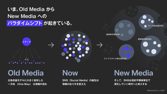 メディアエイドは、2021年4月の創業以来、TikTokアカウント運用支援事業を軸に、企業の集客や採用の課題をソーシャルメディアの力で解決するSNSソリューション事業を展開してまいりました。2025年3月、メディアエイドは新たに「知らなかったを救う。」というミッションを策定し、オールドメディアからニューメディアのパラダイムシフトの実現に向けて、コーポレートブランドをアップデートするに至りました。