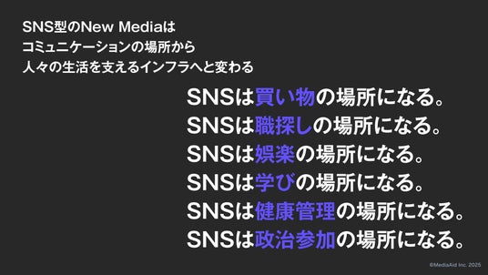 我々はこの時代の潮流に注力いたします。SNSをあらゆる領域における生活インフラへと進化させ、メディアのパラダイムシフトをその最前線で牽引します。汎用型SNSを垂直にマネジメントするのみならず、特化型SNSをゼロから創り出すことによって、ヒューマンセントリックな意思決定を実現し、「知らなかったを救う。」というミッションを実現してまいります。