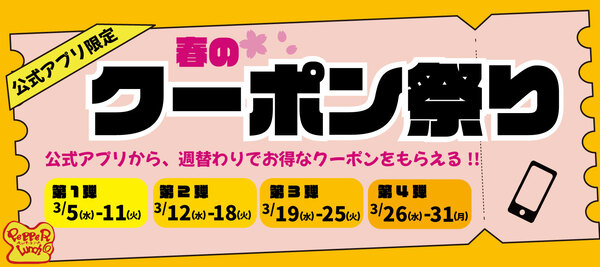 ペッパーランチアプリ史上初、週替わりでクーポンを配信する「春のクーポン祭り」を開催。定番のペッパーライスはもちろん、期間限定メニューをお得に楽しめるクーポンを配信する。