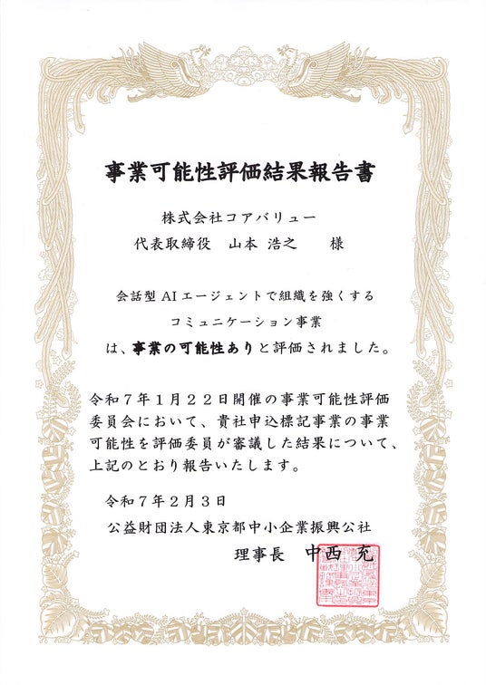 この度、株式会社コアバリュー(本社:東京都渋谷区、代表取締役:山本 浩之)が運営する、会話型AIエージェント「ValueTalk」が、公益財団法人東京都中小企業振興公社より「事業の可能性あり」と評価を受けました。これにより、振興公社によるアドバイスや定期的な事業推進ミー ティング、著作権管理体制構築のための東京都知的財産総合センターによる支援など多岐にわたり事業サポートが施される運びとなりました。