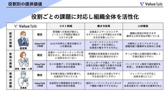 このビジョンを具体化するために開発したプロダクトが、会話型AIエージェント「ValueTalk」です。この会話型AIエージェントを活用することで、企業や組織はリアルタイムで組織状況を把握し、素早く意思決定を下すことが可能です。また、組織内コミュニケーションやチームワークが向上し、組織全体の効率が高まることで、全体パフォーマンスもさらに向上します。企業にとって、この組織力向上プロセスや生きたデータ活用は、人的資本経営に持続的な価値をもたらし、長期的な成長と競争力強化に寄与すると考えています。