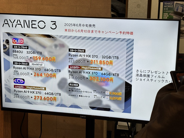 ポータブルゲーミングPCのフラグシップモデル「AYANEO 3」が3月5日、秋葉原ハイビーム本店で日本初お披露めとなった。6月中旬に販売開始、本日より予約開始となっている。