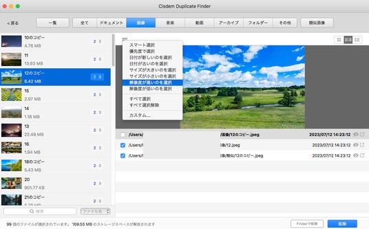 Cisdem Duplicate Finderは自動選択機能を搭載しています。重複ファイルを検出してくれた後、自動選択ルール(例えば「解像度が高いのを選択」)に基づき、各グループの重複ファイルから1つのファイルだけ残し、他のファイルにチェックを入れます。自動選択ルールを利用することで重複ファイルを削除するのはより簡単になります。