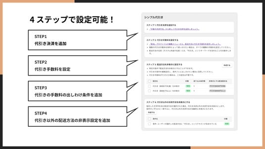 「シンプル代引き|お手軽代引き手数料自動計算アプリ」を使うと、4 ステップで代引き手数料の自動計算を設定可能です。