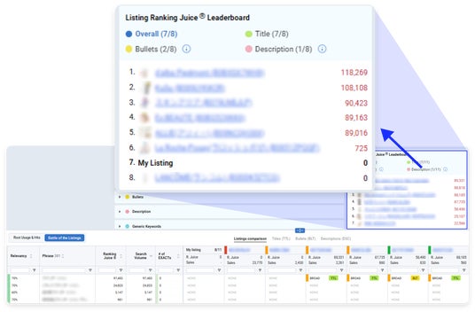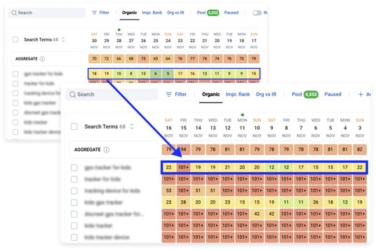 顧客1:特定商品の所属カテゴリーにおいて、競合との比較を行い、どのキーワードで優位または劣位にあるのかを可視化しました。この結果に基づき、商品のパフォーマンスを改善し、SEO効果を向上させました。