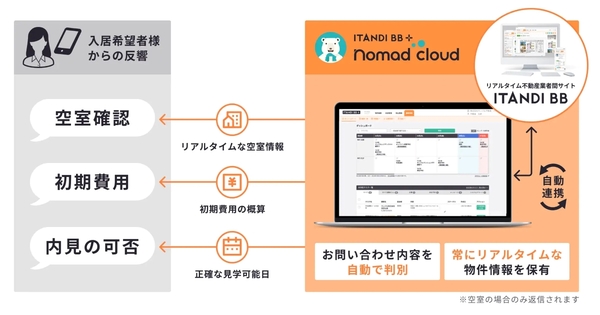 最も効果を発揮したのは“メールの反響”だ。メールでの問い合わせの7割を占めていた、空室状況や初期費用の確認、内見の可否などの“物件確認”を、ノマドクラウドの「物確即レス機能」が即座に自動返信する。同機能では、AIが問い合わせ内容を判別して、イタンジの不動産間サイト「INTANDI BB」と連携することで初回対応を自動完結させる。残り3割となる確度の高い反響は、メールやLINE、電話で手厚くフォローする。