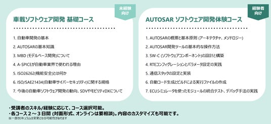 当社のソフトウェア教育サービスは、次世代の車載ソフトウェアエンジニアを育成するプログラムで、法人企業様向けに、車載システム概論からAUTOSARを利用したソフトウェア開発など、熟練度に合わせた研修プログラムを提供しています。