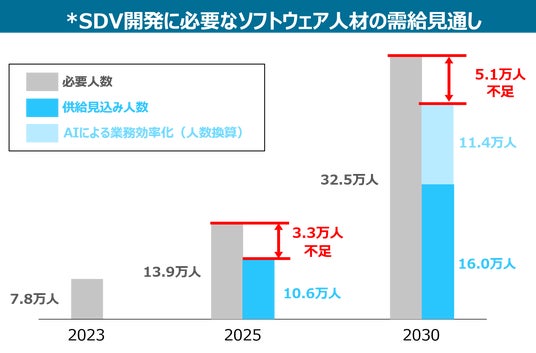 モビリティDX検討会(経済産業省)によると、労働力人口の減少や国際的な人材獲得競争による供給不足、SDV市場の拡大によるさらなる需要増加により、SDV開発に必要なソフトウェア人材は、2025年に約3.3万人、2030年に約5.1万人不足する見込みとなっています。