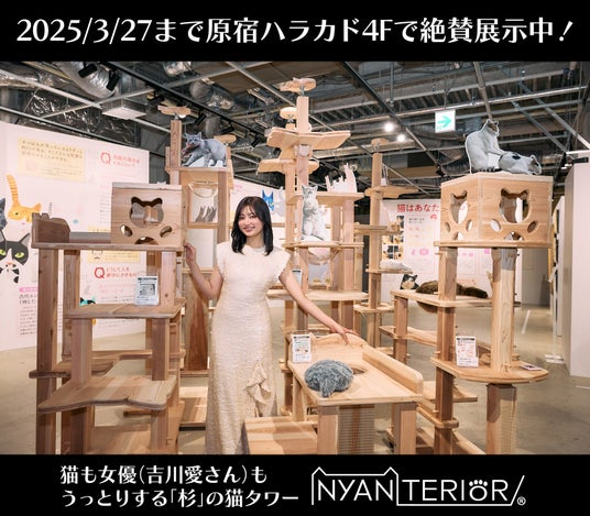 ねこの日おめでとう『NyART FESTIVAL』のニャンバサダー、女優 吉川愛さんも、天然乾燥杉に癒されてます!