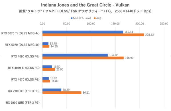 RX 7900 XT+AFMF 2の組み合わせも強いが、RTX 5070 Ti+Smooth Motionも負けず劣らず強い。フルHDではRX 7900 XT+AFMF 2がトップなのに、4KではRTX 5070 Ti+Smooth Motionの平均フレームレートが高くなった理由は、GDDR7の持つ帯域が功を奏したのではないかと考えられる。