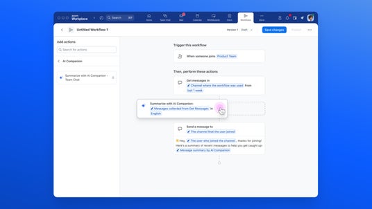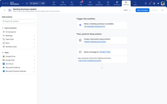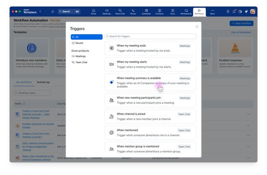 Workflow Automation では、IT 管理者とエンドユーザーの両方が、トリガーが発生すると一定の順序で自動的に実行されるステップやアクションを設定することが可能です。トリガーの例としては、ミーティング後に AI Companion が作成したミーティング要約を、自動的に Zoom Docs、Google Doc、または Word 文書の専用ドキュメントに追加し、その後 Team Chat チャネルで共有することが挙げられます。このように Zoom Workflow Automation と AI Companion を連携することで、チームの連携と生産性を維持することができます。複数のコラボレーター プラットフォームを使用するチームは、断片的なコミュニケーションに悩まされることが多く、情報やプロジェクトのアップデートを把握することが困難です。しかし Workflow Automation を使用することで、チームは常に最新情報を把握し、アクションを実行することができます。