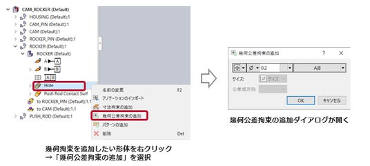従来はリボンアイコンから操作していた「幾何公差拘束の追加」機能が、形体のコンテキストメニューにも追加されました。設定をより直感的に行えるようになり、作業効率が向上します。