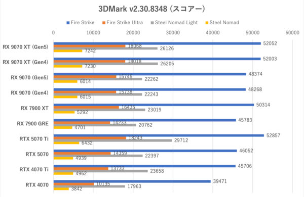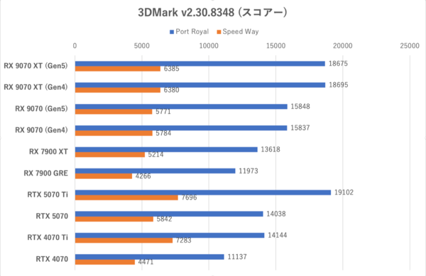 そしてRX 9070シリーズの性能だが、まずRX 7900 GREより高スコアーであることは言うまでもないが、Fire Stike〜Steel LegendまでのテストではRX 9070はRX 7900 XTのすぐ後ろに付けており、RX 9070 XTに至ってはRX 7900 XTより上。そしてレイトレーシングのPort RoyalではRX 9070>RX 7900 XTとなっているだけでなく、RX 9070>RTX 5070になるという金星も見せた。