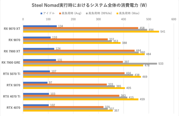 まずRX 9070のTBPは平均250W、ピークでも306W。RTX 5070のFounders Edition(FE)より平均値ではやや高いがほぼRTX 5070 FE相当の設計といえる。RX 7900 GREと比べても平均値で40W近く下がっており、新世代のRadeonといった感じだ。