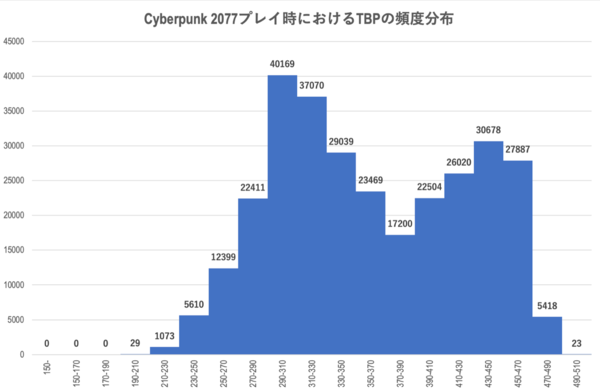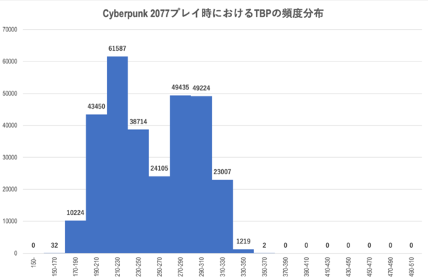 Steel NomadはRay Acceleratorがまったく動かないテストであるため「Cyberpunk 2077」を4K最高画質(レイトレーシング:オーバードライブ+FSR 3“クオリティー”+FG)で5分程度放置し、その時のTBPを1秒間に約1000回程度Pownetics v2でサンプリングした。取得できたサンプル数は約30万、これをヒストグラムにしてみたのが下のグラフだ。横軸にある「200-210」という表記は200W以上210W未満を示す。