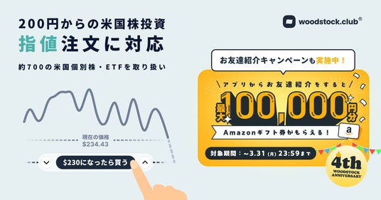 Z世代向けSNS型投資アプリwoodstock.club を運営する、「Woodstock(ウッドストック)」(東京都港区、代表取締役 ブライアン ジェフン ユンhttps://www.woodstock.club/ )はこの度、従来の成行注文に加え、指値注文機能を実装、ローンチいたしましたことを発表させていただきます。200円から米国株が取引できるアプリとして2023年にローンチ以来、Z世代など若年層を中心として、たくさんの皆様にご利用いただいてまいりました。これまで成行注文のみをサポートさせていただいておりましたが、この度指値注文に対応、成行注文と同様に、約700銘柄の米国株(ETF含む)の売買を指値注文でも200円から行なっていただけます。また合わせてお友達紹介キャンペーンも開始。アプリから招待コードを使って、ご家族、ご友人が口座開設すると、紹介者にはアマゾンギフトカード、被紹介者にも米国株購入代金(新規口座開設者全員対象)がもらえます。ますます手軽に、そして楽しみながら、資産形成を行なっていただけるよう、引き続き機能、サービスの改善に努めて参ります。