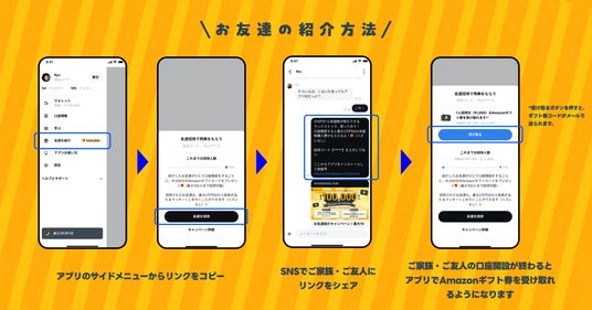 また、合わせてこの度、お友達紹介キャンペーンも開始いたしました。アプリから招待コードを使って、ご家族、ご友人が口座開設すると、紹介者にはアマゾンギフトカード、被紹介者にも米国株購入代金(新規口座開設者全員が対象)がもらえます。アプリ内から、これまでの紹介人数や、獲得したギフトカードのコード発行なども簡単に行なっていただけます。家族やご友人と一緒に、お互いのポートフォリオをシェアしながら、楽しく資産形成に取り組んでいただくきっかけとして、ぜひご活用ください。