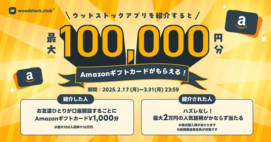 ご入金を完了されたお友達1人につき、1,000円分のアマゾンギフト券をプレゼント。最大100人まで、100,000円分のギフト券が獲得可能です。キャンペーンの詳細については、以下のサイトをご確認ください。https://woodstock.club/press/referral-campaign-202502
