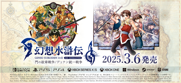 コナミデジタルエンタテインメントは3月6日、『幻想水滸伝 I&II HDリマスター 門の紋章戦争 / デュナン統一戦争』を、Nintendo Switch/PlayStation 5/PlayStation 4/Xbox Series X|S/Xbox One/PC(Steam/Windows/Epic Games Store)で発売。価格はパッケージ版/ダウンロード版ともに5500円だ。