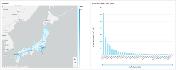 アンケートの回答状況はAmazon QuickSight で可視化されるため、日本全国だけでなく韓国やアメリカなど海外からも参加者がいることがわかります。