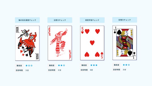 「のうKNOW」は、トランプカードを使ったゲーム形式の4つのテストで脳の反応速度や注意力、視覚学習能力、記憶力といったブレインパフォーマンスを測定するセルフチェックツールです。