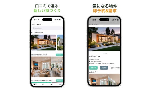 特徴としては、独自開発のSNS分析ツール「Pegasus Housing」(登録アカウント5,900件超)を活用し、各住宅会社の評価を客観的に数値化。広告費よりも「実際に家を建てた方の声」を重視しSNSの評価や口コミをもとに上位掲載されることから、SNSの生の声を反映しているので、信頼できる判断材料となり、住宅購入検討者を後押しします。また、地域別にランキングを確認できるので、人気の施工例やデザインをスムーズに探すことが可能。住宅会社各社のデザイン事例・モデルハウス画像を一括比較できる機能や、エリア・予算・工法など、豊富な検索機能が備わっており、資料請求や来場予約もアプリ内ですべて完結します。